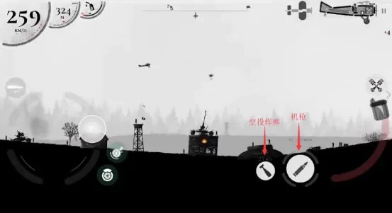 加油完成后按照起飞教程重新起飞,途中会遇到敌人,可以使用右下角的空投炸弹和机枪进行攻击。新手教程只需使用空投,空投炸弹要注意打提前量,不然很容易就MISS。
