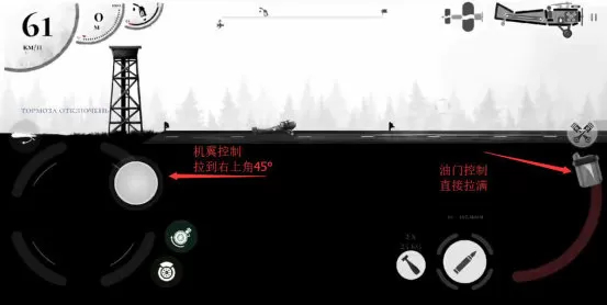 首先把左边的机翼控制摇杆拉到右上角,把右边的油门按钮拉满,之后飞机就会自动起飞。