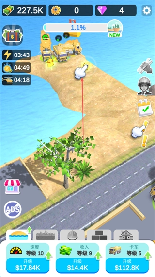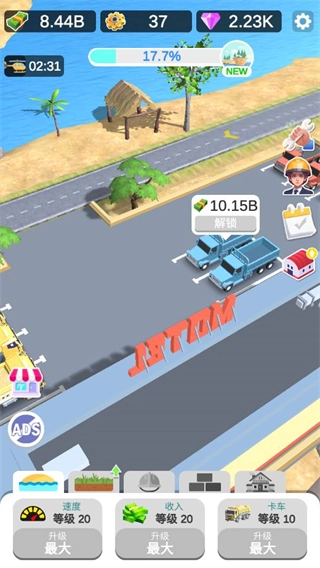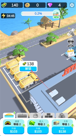 在卡车区域点击解锁按钮,消耗相应资源即可解锁新的沙子运输卡车。