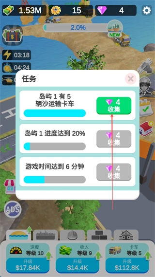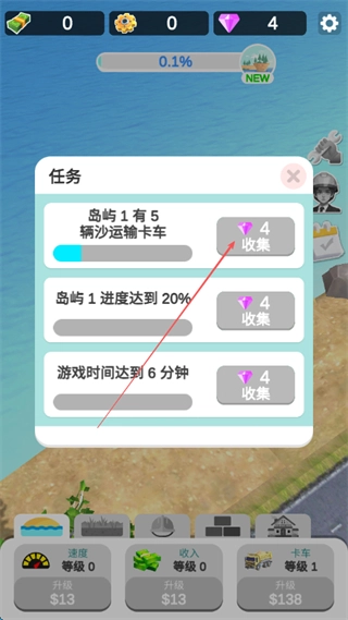 在完成岛屿1的5辆沙运输卡车任务后,点击收集按钮即可领取4颗钻石的奖励。