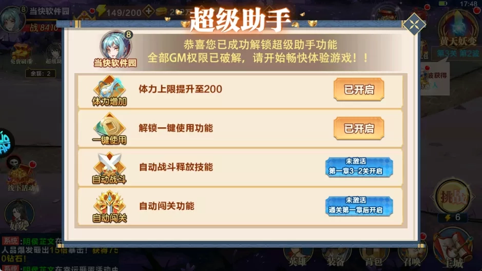 5、超级助手,超多功能直接解锁,一键升级、自动战斗,挂机养成一步到位