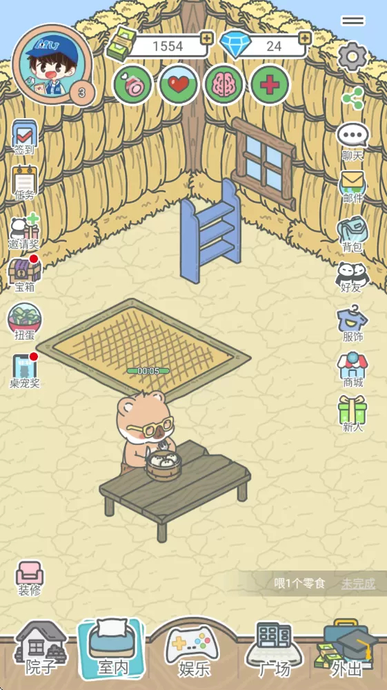 2、进入游戏后就可以看到自己的宠物了,上面的4个圈圈分别代表了饥饿、心情、睡觉和健康。
