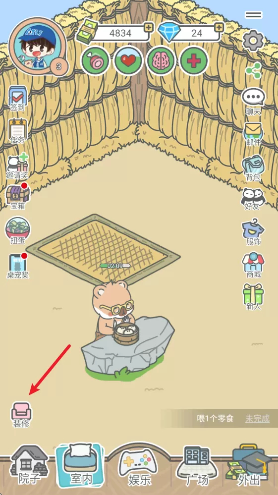 4、回到家中,点击宠物,然后点击第一个刀叉按钮,这样就能够给宠物喂食了。