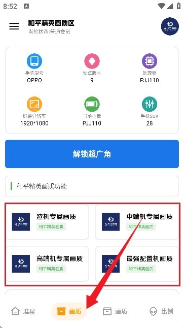 在【画质】界面中,我们可以看到这里提供了针对多种处理器、分辨率及不同设备类型的画质优化功能(如图所示),涵盖了中高低端设备的适配需求。