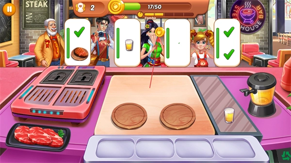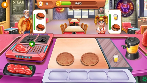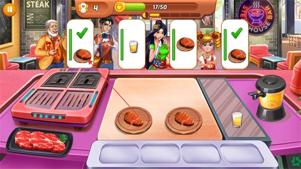 进入游戏后,先观察屏幕上方显示的顾客需求标识,像牛排和饮品的样式都要留意,另外也别忘了查看当前的关卡进度条显示为17/50。