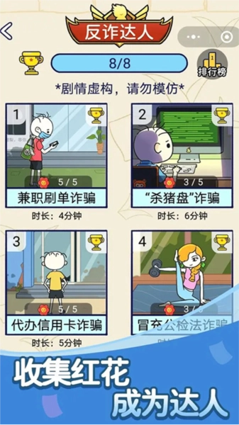 《反诈达人游戏》改编自真实发生的诈骗案件,通过寓教于乐的形式让玩家沉浸式体验贴近现实的场景,从而更深刻地意识到诈骗行为带来的危害。不管你是想测试自身反诈骗水平的朋友,还是渴望掌握更多防骗技巧的用户,都别犹豫,来试试这款游戏,开启专属于你的反诈探索之旅吧!想要突破自我、提升防骗能力?那就赶紧进入《反诈达人》的世界,用实际行动守护自己和身边亲友,远离欺诈的伤害!