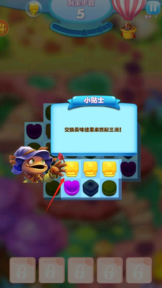 进入关卡界面后,先观察糖果的布局情况,接着通过调换相邻糖果的位置,使三个或三个以上相同的糖果连成一条直线。