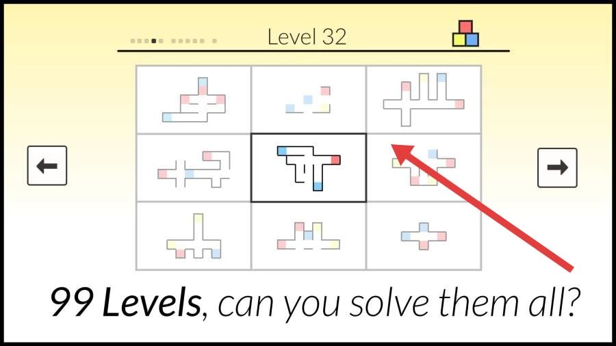 点击“Play”按钮进入游戏,接着选择具体关卡(例如Level32),之后仔细观察彩色方块的分布布局,再规划好方块的滑动路线。