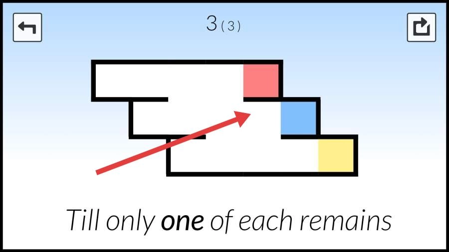 在单个关卡中,通过滑动方块进行合并与消除操作,最终保留每种颜色各一个方块,以此达成“Till only one of each remains”的目标。