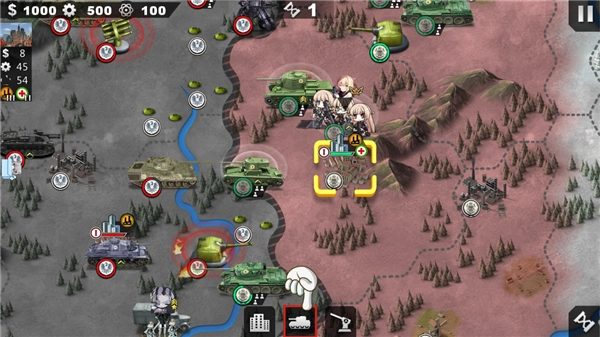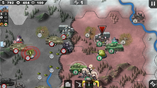 闪烁的区域提示可移动的位置,红圈标识敌方部队,可对其发起攻击。