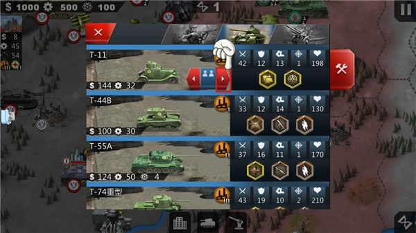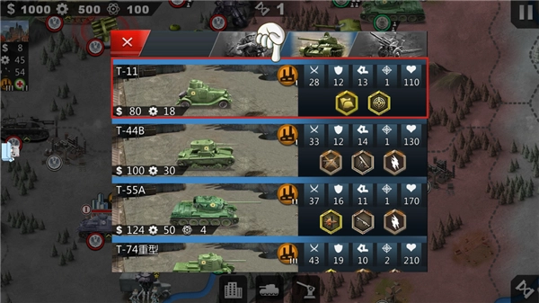 不同的建筑能够产出不同的部队,产出部队需要耗费资源,我们点击下方的坦克图标。