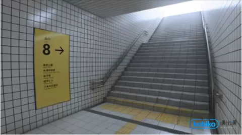 3、正常通道具备这样的特征:铺设着白色瓷砖,中间有一条十分显眼的黄线,上方白灯整齐排列,还有黄色的8号出口标识为你指引方向。