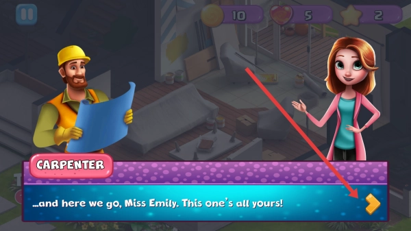 进入剧情对话后,可通过点击箭头按钮推进流程,跟随木匠与Emily的交流,开启设计任务。