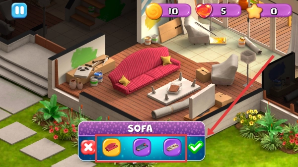 在沙发设计环节,按照箭头指示操作,从下方选项里挑选出喜欢的样式,再点击对勾确认,就能完成沙发的设计与布置啦。
