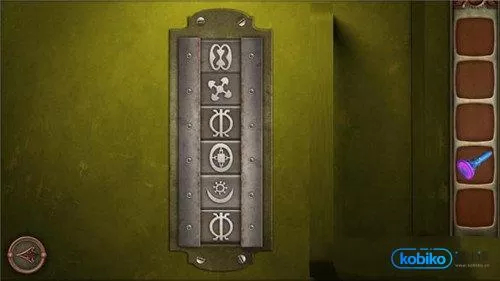 13、下楼梯,点击门,将6个图形调整到之前图纸上的顺序即可,根据图纸上的箭头来,中间的圆是出发点,上图前5个是对的,将最后一个标志换成4个螺旋的圆圈标志,点击门就打开了,通关。
