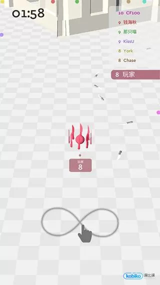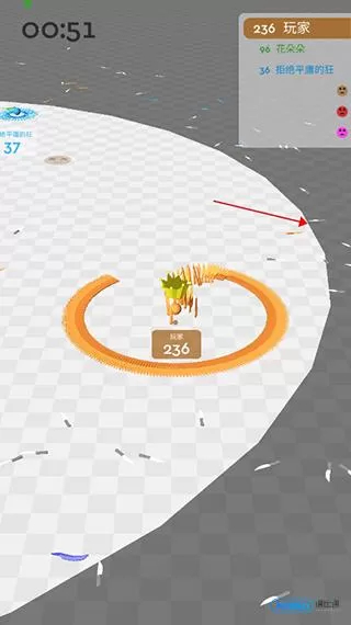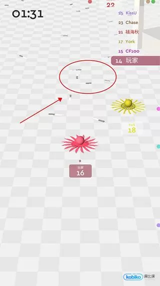 游戏前期,玩家要操控球体收集散落在地面的飞刀。收集的飞刀数量越多,所获积分越高,战斗力也越强。玩家可在右上角查看自身积分排名。