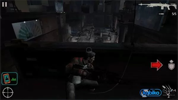 1、安装好游戏,游戏开始我们将身处天台上,并在一个掩护的状态。点击右侧的盾牌箭头图标,主角将站起离开掩护。