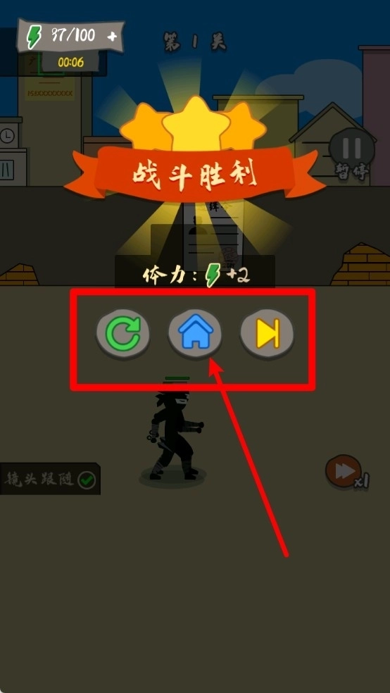 战斗胜利后,你可以选择重新游玩当前关卡、返回主页面或者进入下一关;如果需要回到主页面重新进行配置,点击中间的蓝色房屋图标即可。