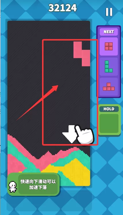 2. 手指向下滑动,可加快方块坠落速度,合理运用此操作,能迅速填补空缺位置。