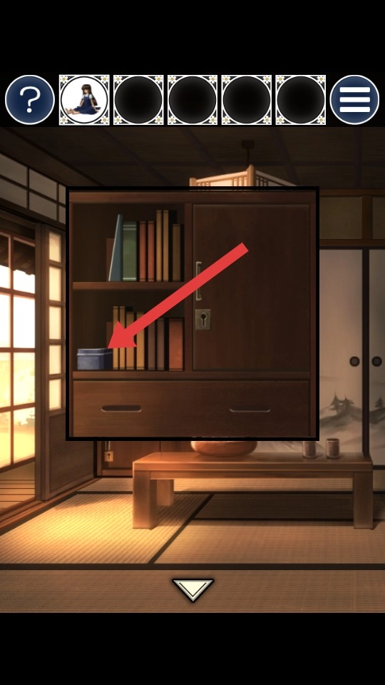 放大书架的画面后,点击红色箭头所指向的【蓝色盒子】,看看盒子里面有没有能帮我们逃脱的物品。