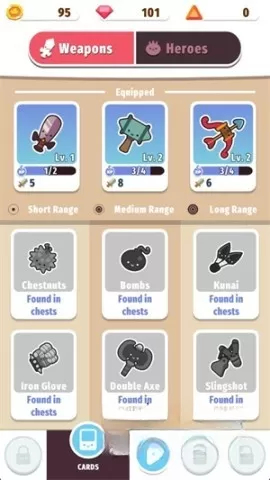 6、在主界面点击Cards,查看已解锁的武器,选择武器进行升级,消耗金币和经验值。