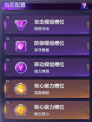 4、金色核心:高能喷射,选择高能喷射和骑士核心,这两套模组搭配,可以激活亚瑟三次突进能力,虽然每次突进的距离会相应减少,但是三次突进更能使敌人措手不及。骑士核心则可以使亚瑟的移速以及攻击速度大幅度提升