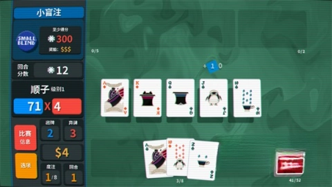 点击“开始游戏”按钮后,你的核心任务是利用各式各样的牌型组合赢取筹码,最终战胜对手所下的盲注。