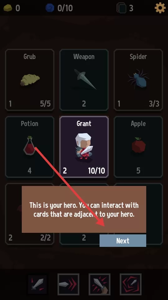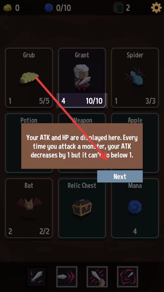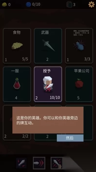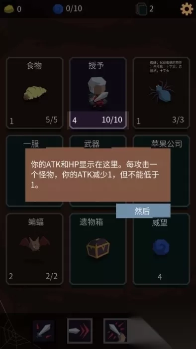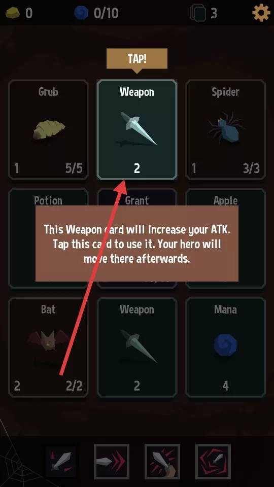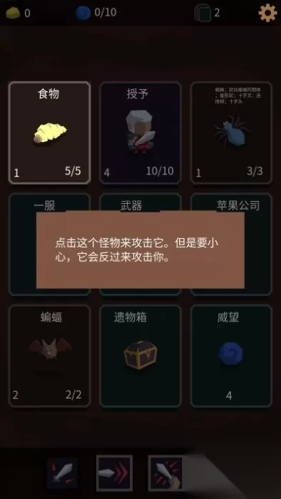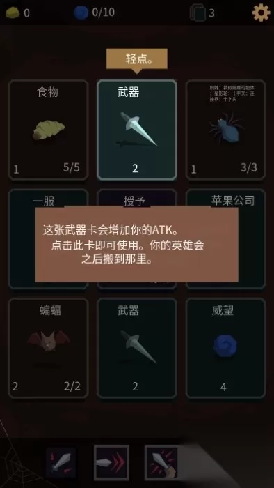 1、轻触武器卡牌能提升攻击力,触碰血瓶可恢复血量,但千万别随意点击怪物卡,除非你想被怪物反杀。