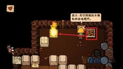 5、走到提示板附近,依照指示将右侧的柴堆点燃,随后打开右侧的门。
