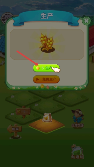 种植完成后,点击“5生产”按钮,消耗5个金币,小麦就会进入生长阶段,从而推进培育进程。
