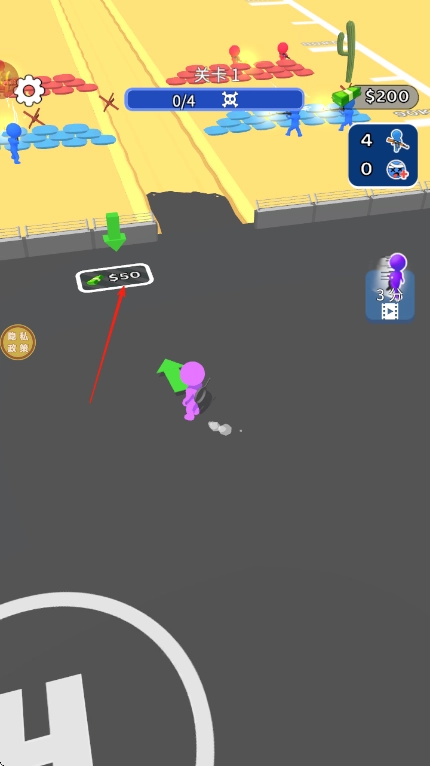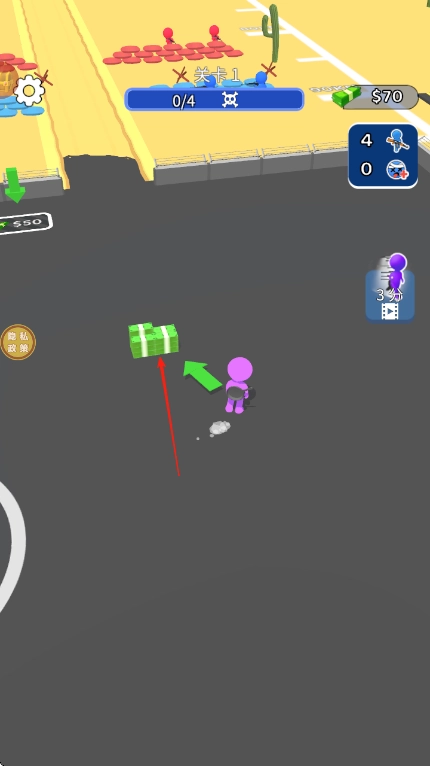 继续操控紫色小人移动,拾取地面上带有$50这类标识的金钱道具,让游戏内的金钱数量从$70增长到$200。