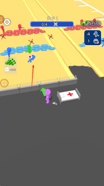 注意观察场景里受伤的蓝色小人,按照红色箭头的指示,引导紫色小人移到蓝色小人身边进行救援,每次成功救援都会出现对应的提示信息,只要完成4次收集物品与救援受伤小人的任务就能通过这一关卡。