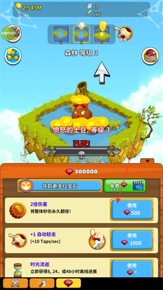 可以用红宝石解锁增益效果,像2倍伤害、+1自动攻击这类,能提升攻击效率,让击杀怪物的速度更快。