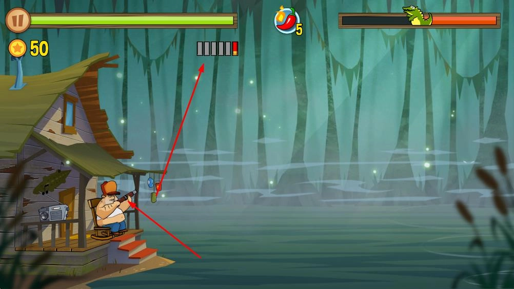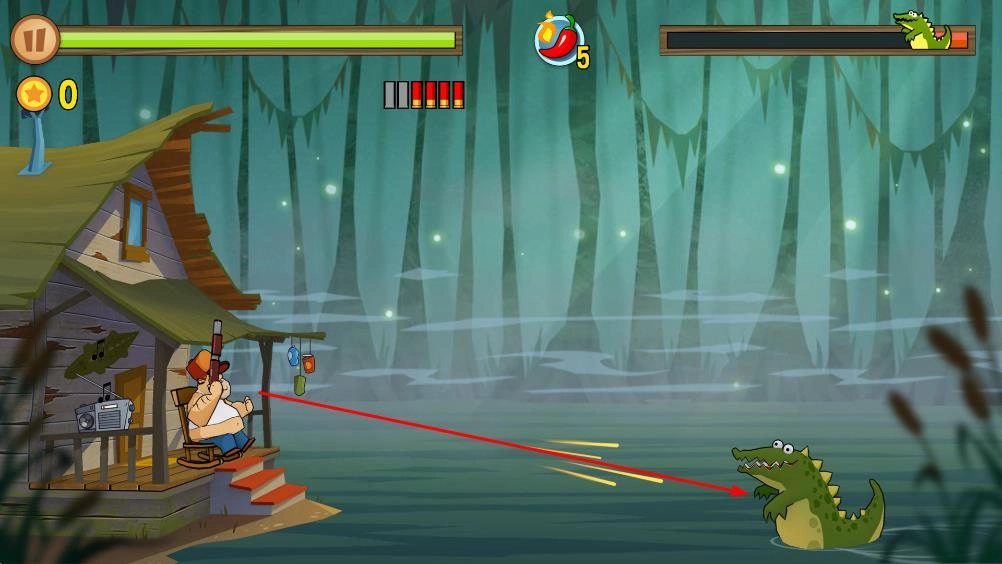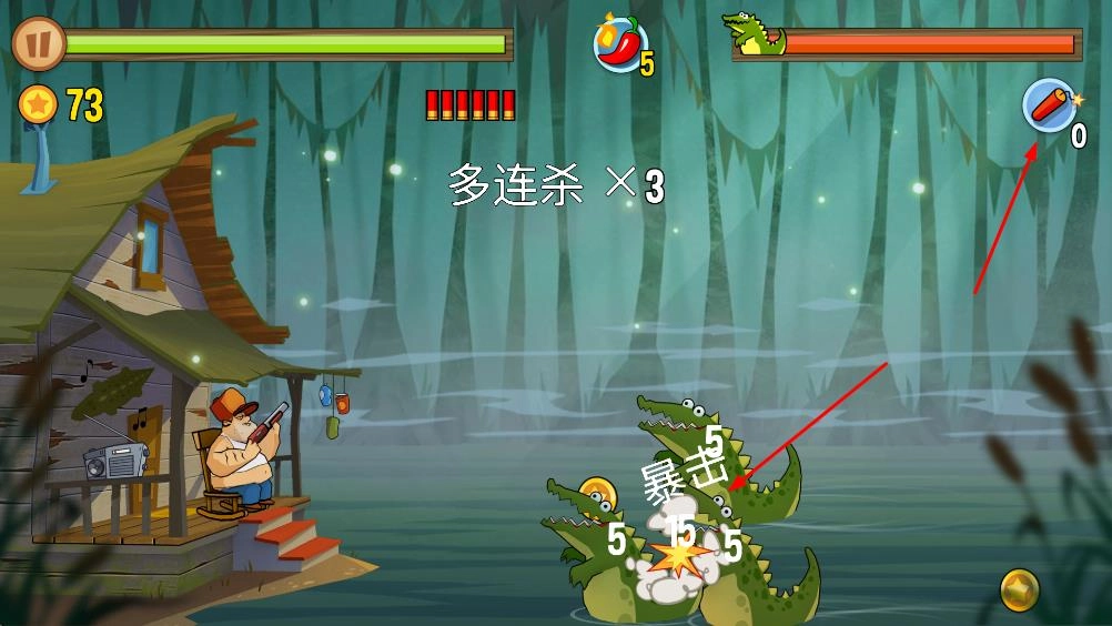 在游戏场景里,玩家操控角色用枪械攻击鳄鱼之类的敌人,界面上会显示生命值、能量值以及击杀得分。