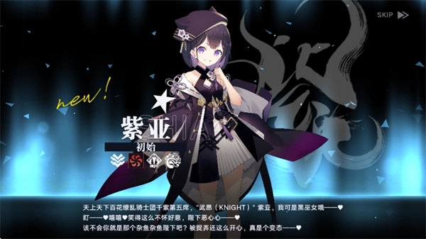 天上天下百花缭乱骑士团千紫第五席,“武昂(KNIGHT)”紫亚,我可是黑巫女哦——盯~嘻嘻,笑得这么不怀好意,陛下你好恶心啊,该不会你就是那个杂鱼杂鱼陛下吧?被捉弄还这么开心,真是个变态。