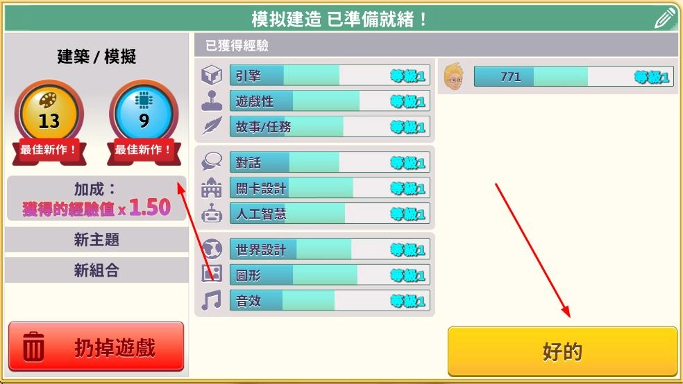游戏开发完成后,可查看游戏经验值及各模块等级,以此获取经验加成,进而提升开发效率与游戏品质。