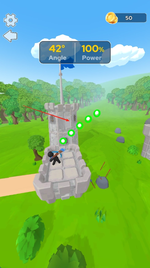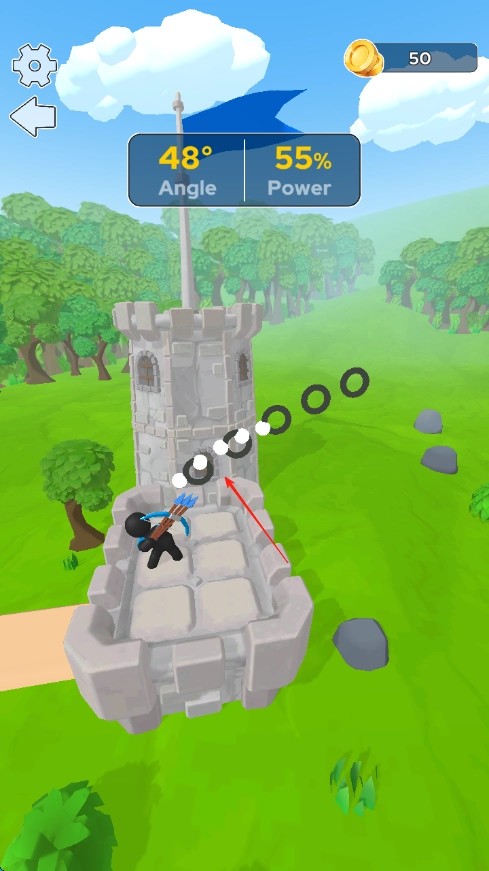 进入游戏后,映入眼帘的是城堡场景,此时你需要操控角色,按照红箭头所指的方向,留意上方显示的角度(Angle)与力度(Power)数值。