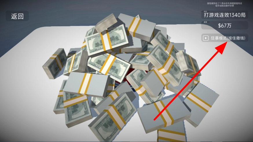 持续按住按钮,用手指滑动来移开堆积的金钱,感受操作过程中金钱积累的变化,沉浸在这种有趣的模拟体验里。