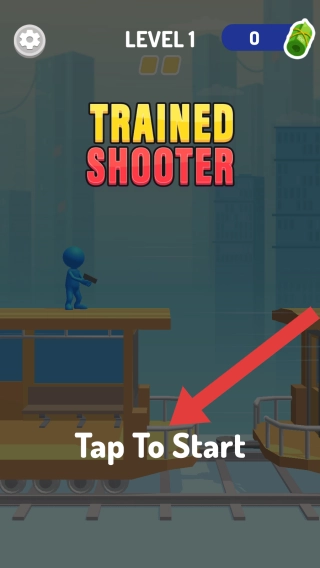 当前处于第1关LEVEL1,界面上有“TapToStart点击开始”的提示,此外还设有设置图标、绿色道具图标及其数量显示,背景呈现为城市建筑与轨道的场景。
