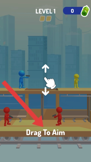 提示“DragToAim”拖动瞄准,画面里有各色火柴人角色,背景是城市建筑与轨道场景,还配有操作指引手势,用来引导玩家完成瞄准操作。