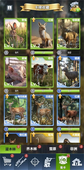 每次狩猎都能收集卡牌碎片来解锁动物卡牌,每张卡牌都具备独特的加成效果,升级卡牌可以增强其技能,这样在猎友们完成狩猎后就能获得更高的分数。