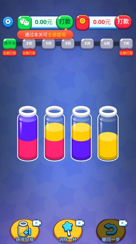 同时还提供了“获得空瓶”“消除一杯”“退回一步”三种道具可供使用。