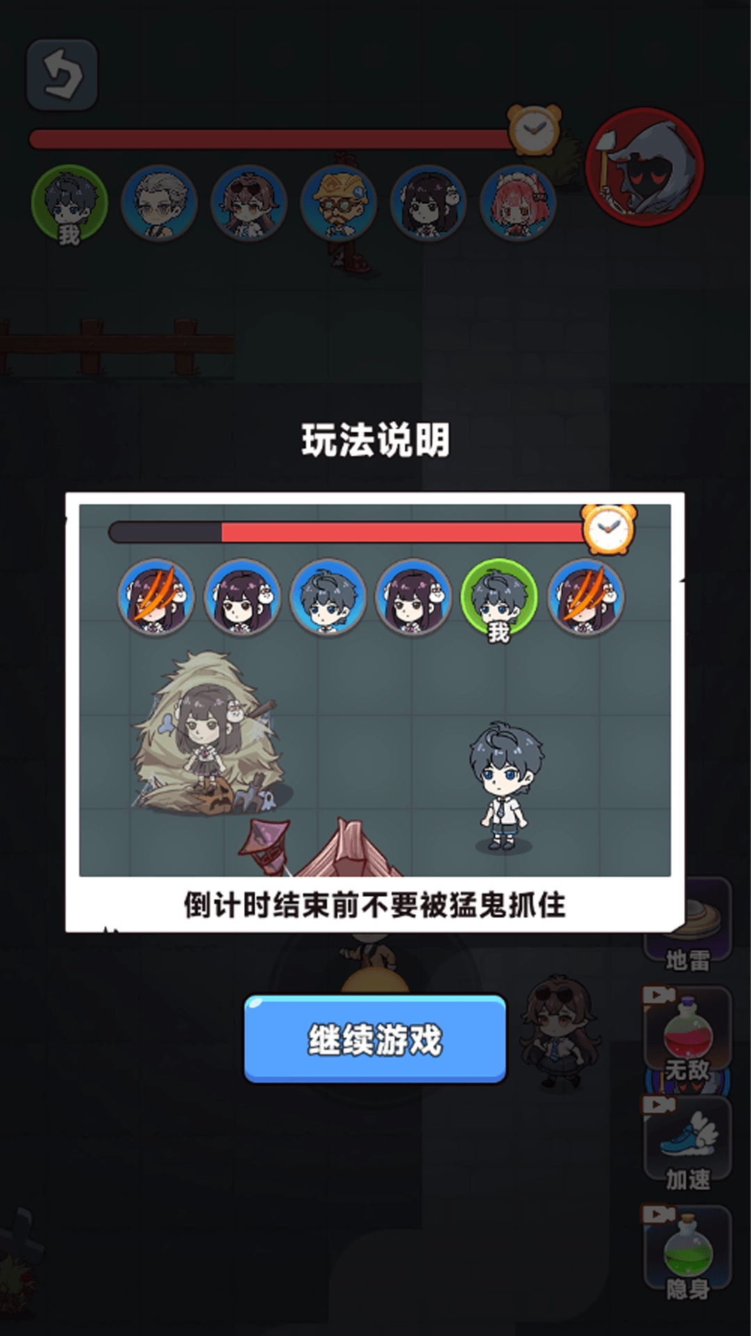 进入地图后,玩家要避开怪物的追捕,寻觅一处安全之地藏身,只要能撑到时间结束就能取得胜利!