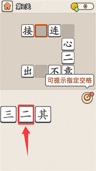 进入游戏后,首先要仔细寻找红色框内标注着数字“二”的选项,精准点击该选项即可开启第一关的成语接龙挑战,准备好迎接这场知识的考验吧。