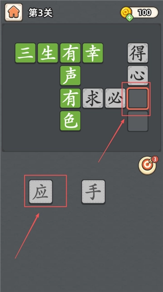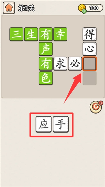 接着点击数字三选项进入下一环节挑战,完成该阶段的成语接龙接续任务,通过增加难度来逐步提升自身的成语储备量。