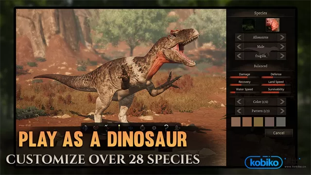 从刚孵化的婴儿开始,然后成长为成年恐龙!超过 25 种恐龙物种可供游玩,包括异特龙、棘龙、剑龙和肉鳄等最受欢迎的恐龙物种。狩猎和攻击其他玩家,保护自己,不要被吃掉成为 Panjura 的顶点!
