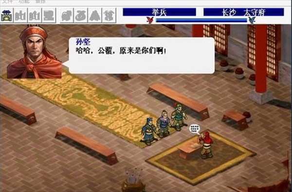 这关难度不大,需要注意的是,孙坚出现时并非如描述中直接降低防御和士气,而是要等他靠近贼首后才会触发对方防御下降的效果。另外,这关总共有5个豆,左边的村庄里没有豆,不必特意过去。最后,击败贼首可以获得太平清领道这件道具。
