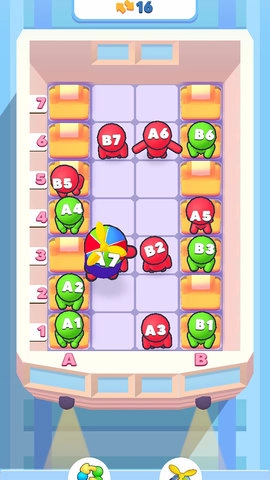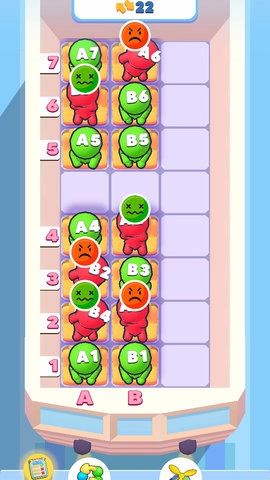 快来排排坐,《排排坐》是一款颇具巧思的益智游戏,其核心玩法采用了经典的分类拼图机制。游戏中,玩家需先找到空位,再根据乘客头上的标识(字母对应竖列、数字对应横排),将他们引导至正确座位。由于座位布局的限制,玩家往往需要借助中间空位作为临时中转,才能让所有乘客归位。当所有乘客都坐到正确位置后,原本愤怒的红色乘客会转为开心的绿色状态,游戏目标即达成。