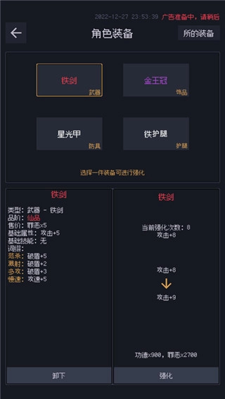 装备收集侧重铁剑锻造,铁甲铁护腿适量获取。首页升品系统可将同品质装备二合一进阶,白装升绿时随机生成词条。铁剑优选加速词条,护腿追求复苏词条(护盾回复+9),防具词条选择相对灵活。