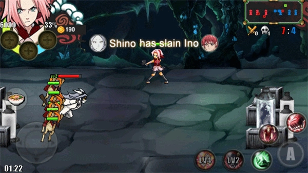 v1.22版本:修复已知BUG,优化游戏体验。重写AI策略增加防守。角色等级四级五级获查克拉加成。提高死亡惩罚复活时间。简化角色动作加快节奏。变更防御塔血量。每秒回复100HP机制加入。装备系统错误修正。联机延迟问题部分缓解。音效同步调整。